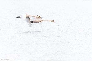 D’ordinaire calme et peu farouche, le cygne peut devenir belliqueux en période de nidification, défendant vaillamment son territoire face à tout envahisseur (animaux et humains). Son vol lourd est précédé d’une phase d’envol laborieuse et bruyante particulièrement spectaculaire.