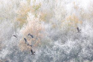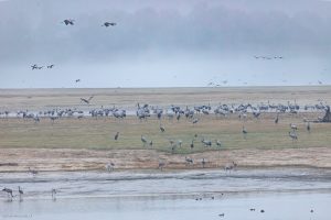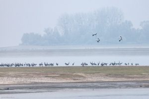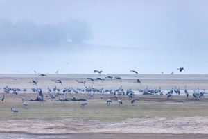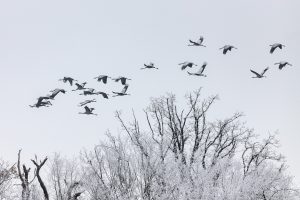 Le retour des grues cendrées sur la plaine lorraine est toujours un spectacle enivrant. C’est en automne et en hiver qu’on peut les observer le plus facilement, quand les colonies viennent hiverner autour des grands lacs lorrains ou marnais. Les nichées lorraines sont rares, quelques couples seulement étant sédentaires. La plupart des oiseaux sont migrateurs et nichent dans les pays nordiques. Dans les Vosges, les seules observations possibles sont en vols, en « V » caractéristiques, lors des passages migratoires.