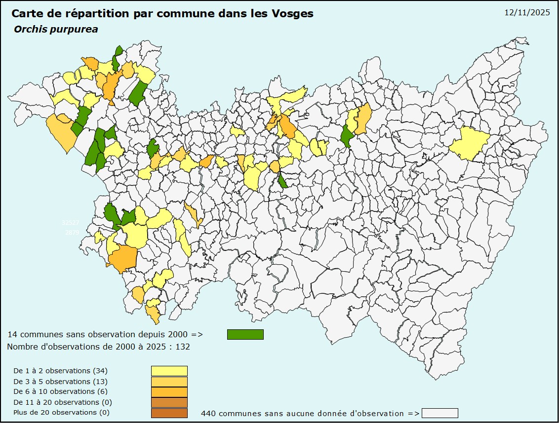 Répartition dans les Vosges : Orchis purpurea est bien représenté dans toute la partie ouest du département, partout où le calcaire affleure. Cette espèce résiste bien quand les pelouses calcaires se ferment et on le retrouve dans les taillis et les bois clairs périphériques.